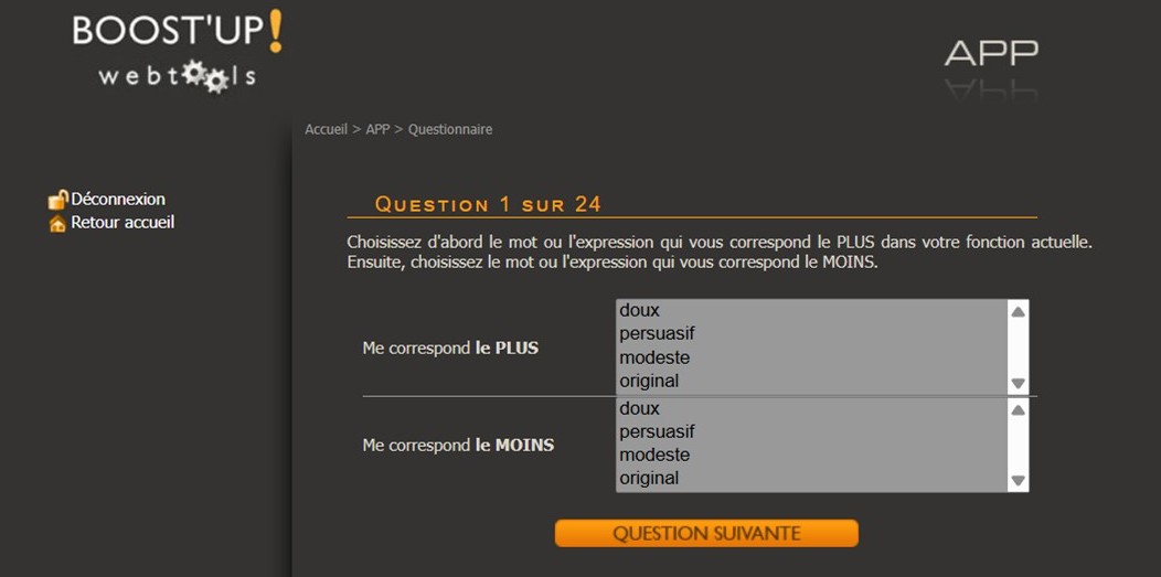 Le participant choisit les mots qui lui correspondent le plus et ceux qui lui correspondent le moins parmi les propositions.